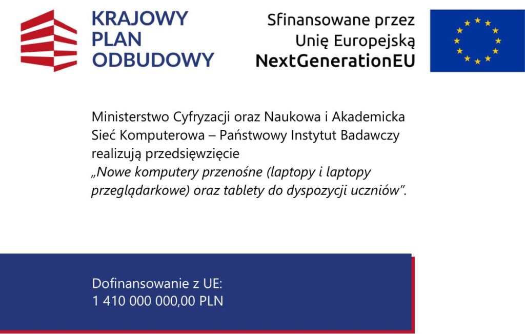 Ministerstwo Cyfryzacji we współpracy z Ministerstwem Edukacji Narodowej realizuje zadania finansowane ze środków Krajowego Planu Odbudowy i Zwiększania Odporności (KPO).