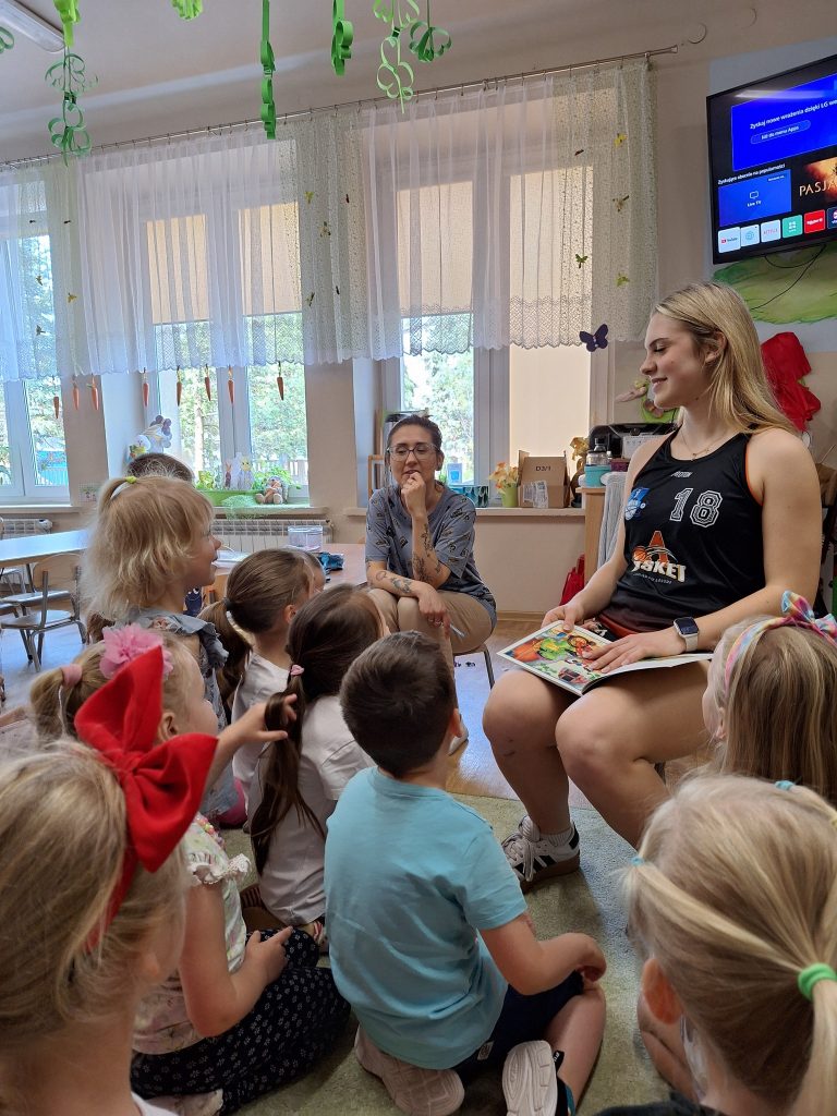 Podczas spotkania nasze zawodniczki czytały przedszkolakom bajki, a następnie z zaangażowaniem odpowiadały na pytania, dzieląc się swoimi doświadczeniami związanymi ze sportem i codziennym życiem młodych sportsmenek, zawodniczek UKS Basket Aleksandrów Łódzki.